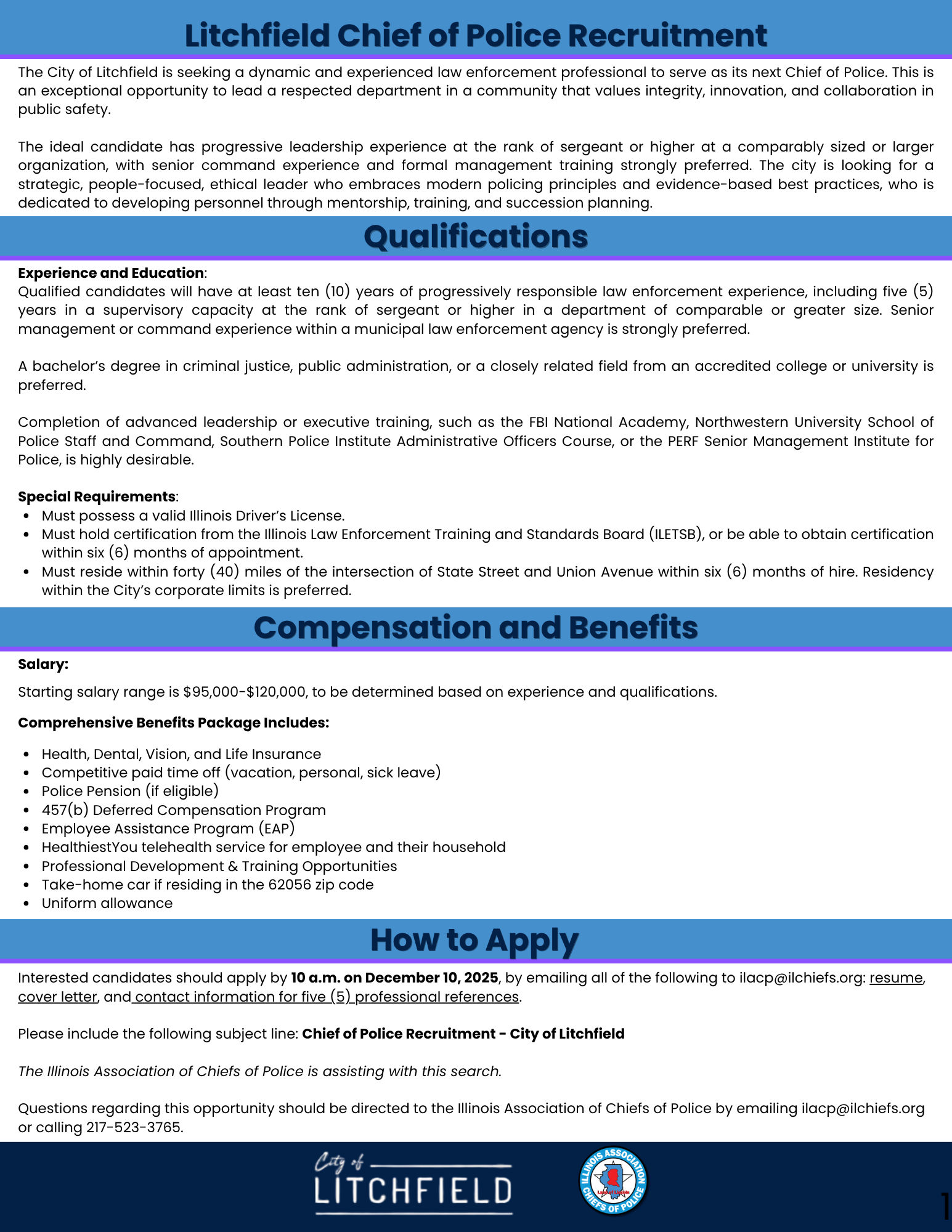 The Women’s Leadership Section within the Illinois Association of Chiefs of Police (ILACP) is aimed at advancing women in law enforcement. Despite progress, women remain underrepresented in law enforcement, particularly in leadership roles, and often face unique challenges in recruitment, career advancement, and professional growth. The establishment of this new section will provide a dedicated, inclusive network to support and empower women officers and leaders, helping to bridge these gaps and foster an environment where all members can thrive. Click here to learn more about the ILACP Women's Leadership Section's mission.